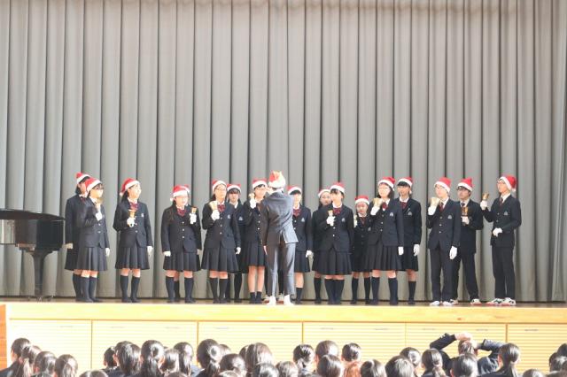 音楽部はクリスマスの衣装を着て、ハンドベルや合唱でクリスマスソングを奏でてくれました。きれいなメロディーに感動した後は、ダンス部の元気いっぱいのダンスが会場を盛り上げました。生徒たちの中からは自然と手拍子が起こりダンス部の生徒もノリノリで踊っていました。
