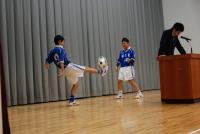 サッカーのパフォーマンスではボールが説明の生徒の頭上を?