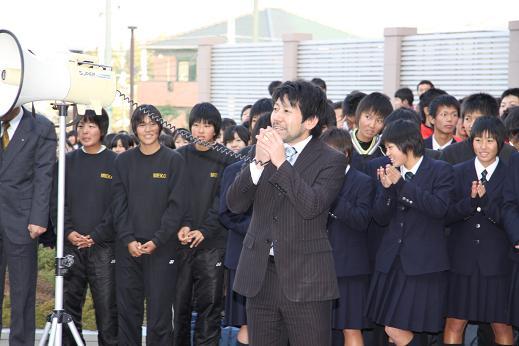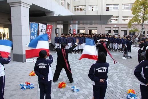 正面玄関付近で報告会があり、大勢の三重中高生が集まり、OBである山中松阪市長も駆けつけてくださり、激励の言葉をいただきました。選手も夏に続く出場に喜びもひとしおで、早速昨夏を越える結果を残したいとの抱負を語っていました。