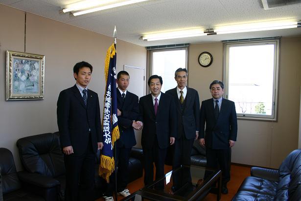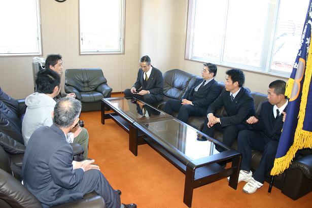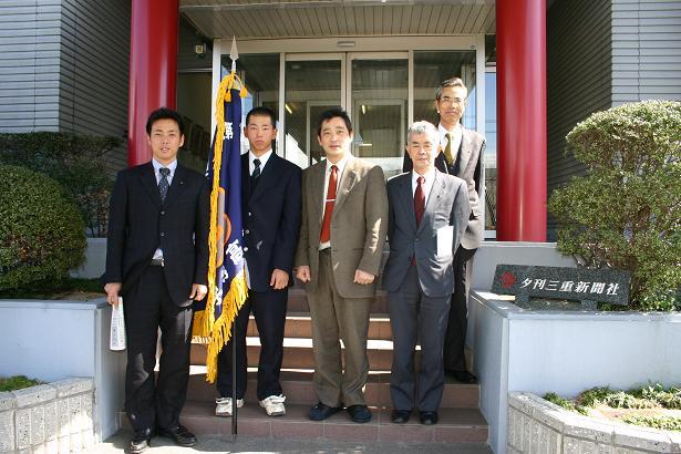 3月10日(水) 茂山主将と垂髪校長、中澤学監、沖田監督と稲葉副部長が地元紙の夕刊三重新聞社を訪問し、センバツ出場の報告をしました。三重高OBの山下社長や小林部長に出迎えていただき、激励の言葉をいただきました。