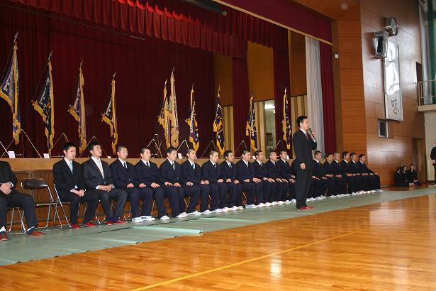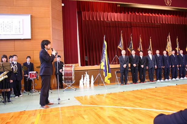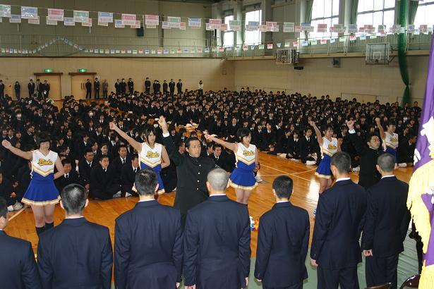 3月15日(月) 山中松阪市長をはじめ多くの来賓の方をお招きし、全校生徒による壮行会が行われました。歴代の選抜旗と第41回大会の優勝旗を背に選手が並び、来賓の方からの激励が、また生徒を代表して生徒会長の励ましの言葉がありました。応援団から力強いエールがおくられました。