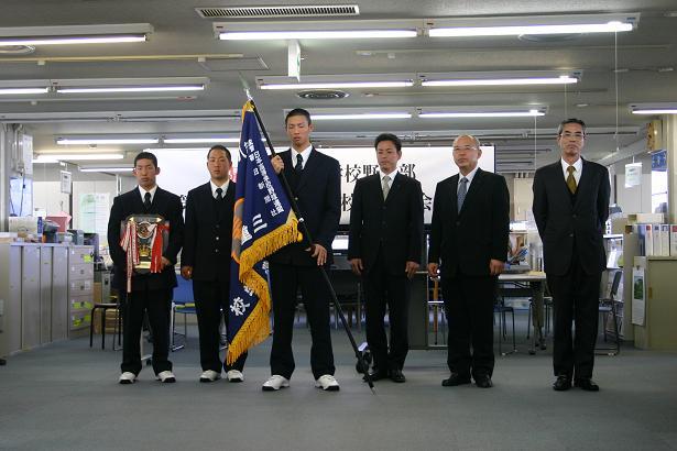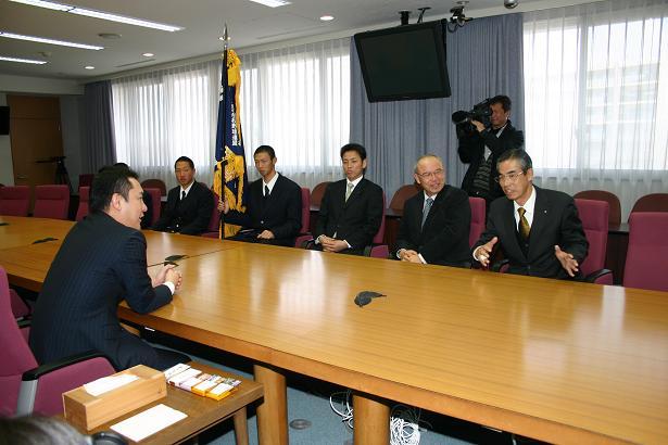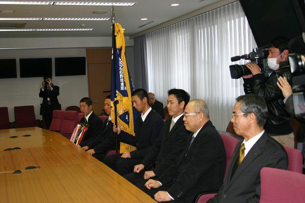 3月13日(火)、岡本主将と三浦投手・小林捕手のバッテリーが垂髪校長、沖田監督、中田部長とともに県庁を訪問し、第84回選抜高等学校野球大会に出場の報告をしました。