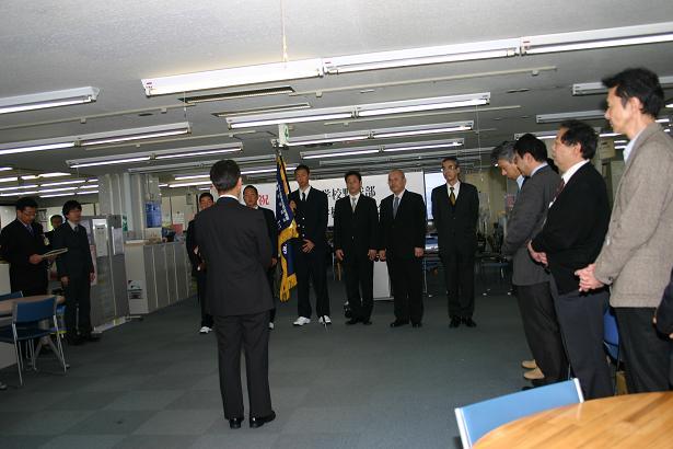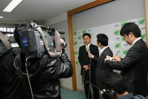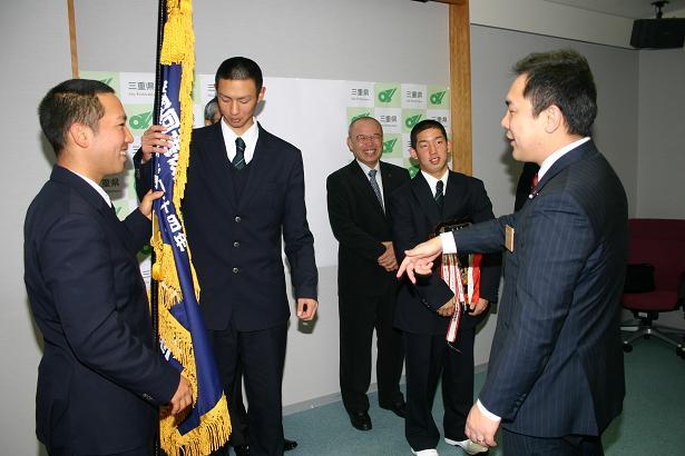 鈴木英敬知事に暖かく迎えていただき、激励のお言葉をいただきました。鈴木知事は兵庫県出身で甲子園にも近く、高校野球を身近な存在に感じていらっしゃるとのことでした。甲子園出場に併せて創立50周年をお祝いしていただいたあと、「最後はチームワークです。チームワークで勝ち進んでください。三重県が元気になるようなプレーを期待しています」「時間が合えばぜひ応援に行きたいと思っています」との熱い言葉も飛び出し、大いに盛り上がった訪問でした。この後、知事室から8階に場を移し、教育委員会・生活文化部の方々に挨拶をさせていただきました。皆様からは拍手で迎えていただき、北岡生活文化部長からは、「昭和44年の優勝時には本当に感動しました。ぜひもう一度優勝してほしい」との激励の言葉がありました。