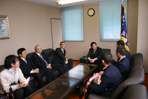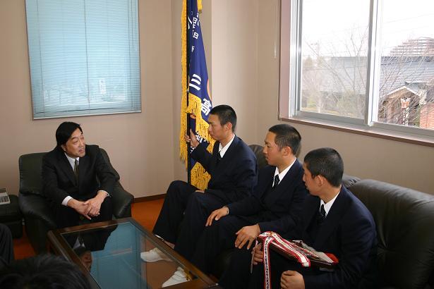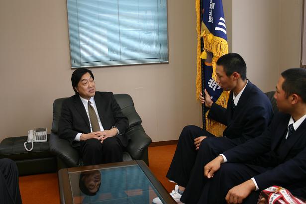 硬式野球部をよく知る山下社長との懇談は終始なごやかな雰囲気で、OBならではの期待と激励を語っていただきました。また、記者からの一問一答方式でインタビューがあり、松阪の応援してくれる人たちにメッセージを求められた主将は、選抜大会は選ばれて出場できる大会なので、チームの力だけでなく、地域の方々に認めていただいて出場できるのだと思い、その感謝の気持ちをプレーで表したいと返事をしました。
