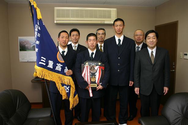 3月12日(月)に、硬式野球部を代表して、岡本主将・三浦投手・小林捕手の3名が、垂髪校長・沖田監督・中田部長と共に、地元松阪の新聞社である夕刊三重新聞社を訪問しました。三重高校卒業生の山下社長に出迎えていただき、第84回選抜高等学校野球大会への出場の報告をしました。