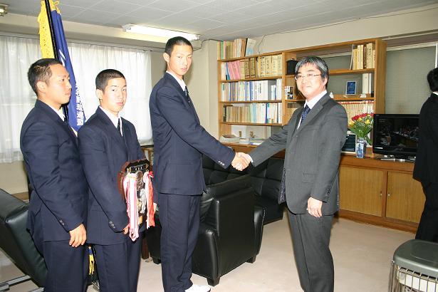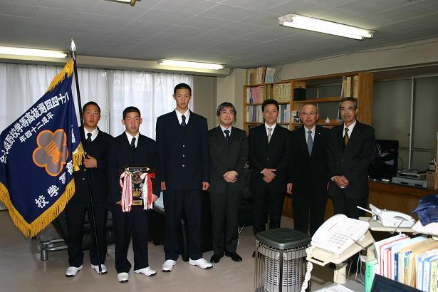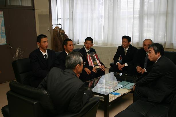 岡本主将・三浦投手・小林捕手が、垂髪校長・沖田監督・中田部長とともに、第84回選抜高等学校野球大会への出場の挨拶をするため毎日新聞社津支局を表敬訪問しました。津支局では広田晃支局長に迎えていただき、激励のお言葉をいただきました。広田晃支局長は、9日(金)に行われた選抜旗授与式にも出席していただきましたので、本校の伝統や野球部についてよくご存知でした。抽選会を明後日に控え、迫ってきた大会に向けての意気込みを伝え、支局長からは東海を代表するチームとして力一杯のプレーを期待するお言葉をいただきました。