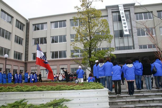 この後、応援部が厳しく熱いエールと、「勝つぞー、勝つぞー三重校」の声援が送れられました。出発式を終えた選手たちは足早にバスに乗り、拍手で見送られて甲子園に向かいました。今日の午後は甲子園で練習をする予定です。大会を迎える準備はもうできているようです。