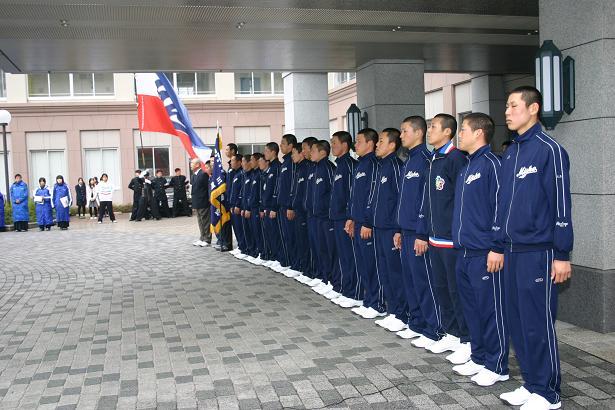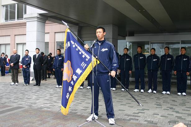 最後に、主将の岡本くんから決意の言葉がありました。「ここに集まっていただいた皆様はもちろん、多くの方々に支えていただいて出場できるのだと思っています。感謝の気持ちをプレーに込めて試合に臨みます。今後ともも応援をお願いします」と。選抜旗を握った岡本くんの言葉には強い決意が感じられました。