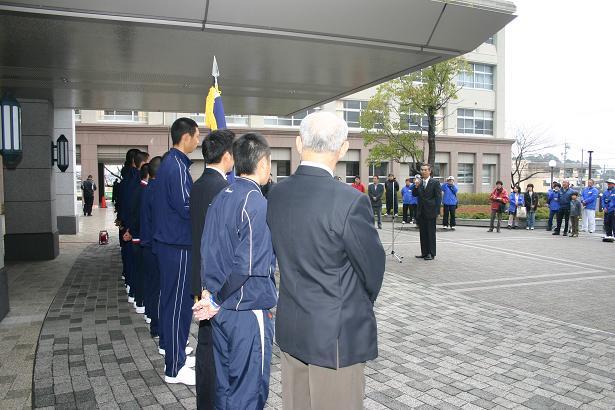 続いて、硬式野球部後援会を代表して野球部OB会の高倉修様より「たくさんの部員の中から選ばれた皆さんは、同時に三重県の、そして東海地区の代表です。代表にふさわしい堂々としたプレーをしてください。私も第1日目の試合をしたことがあります。慣れない場で緊張するでしょうが、相手校も三重高校も、どちらも同じ条件です。日頃の練習で培った力を出し切って、勝利をつかんでください。」との言葉をいただきました。