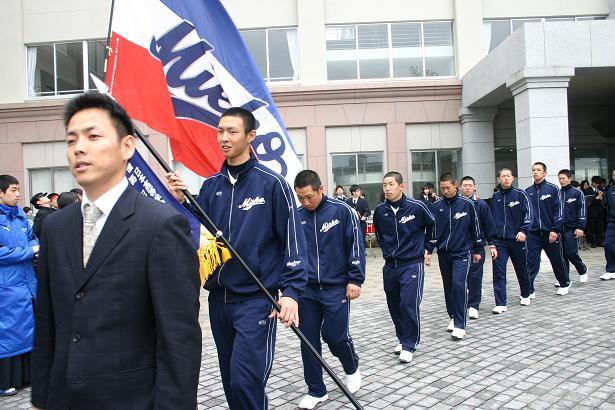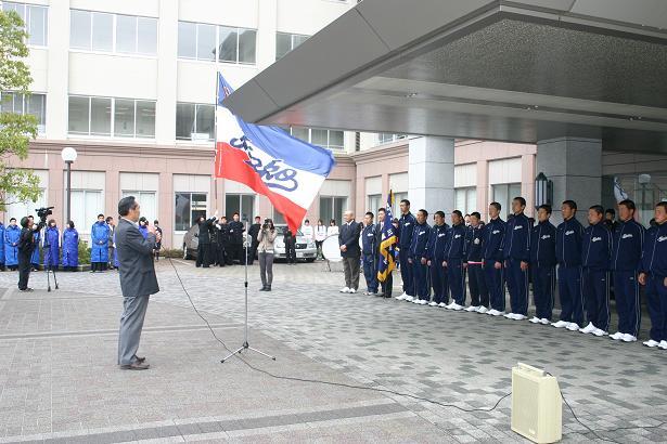 屋上から吊り下げられた垂れ幕と応援団の大団旗が、雨上がりのそよ風に揺れる中、中田部長、小森副部長、沖田監督に率いられて選手が入場し、出発式が始まりました。