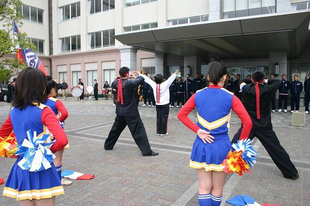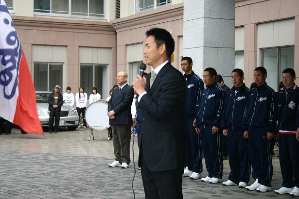 学校長から「選手の皆さん、43年前に優勝した時と同じように大会初日の第一試合を引き当てました。幸先のいいスタートです。今こそ本校の建学の精神『学術とスポーツの真剣味の殿堂たれ』を全国に見せる時です。選手の皆さんと応援するスタンドは一体です。チームは負けないと信じて戦ってください。43年前の再来を期待しています」と勝利のエールが送られました。