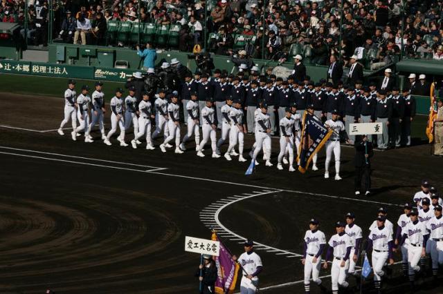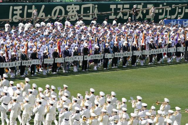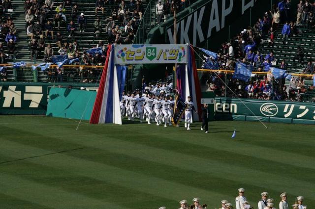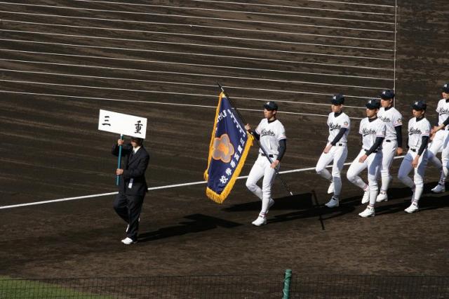 早春の柔らかい陽光が期待や興奮で一杯の甲子園球場に降り注ぐ中、ファンファーレが高らかに鳴り響きました。入場行進が華やかに始まります。音楽隊・大会旗を先頭に北から順に入場です。三重高校は14番目の入場でした。選抜旗を持つ岡本君を先頭に選手全員が胸を張り、腕を振り、足を高く上げて、堂々と行進しました。