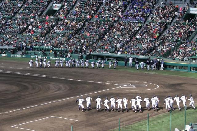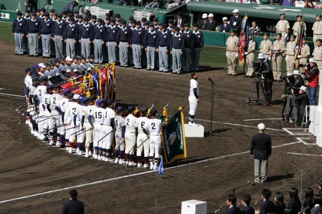 バックスクリーン前に整列した代表32校の選手たちは、春を思わせる暖かい風に背中を押されるように横1列で内野まで進み、開会式が始まりました。平野文部科学大臣を始めとする方々から挨拶を頂いたあと、石巻工業高校主将による選手宣誓がありました。今なお悲しみに暮れている方々に心を寄せ、苦しみを乗り越える決意と感謝を込めた選手宣誓はとても印象的でした。2分間にもおよぶ長い選手宣誓には復興を願う強い思いが感じられました。