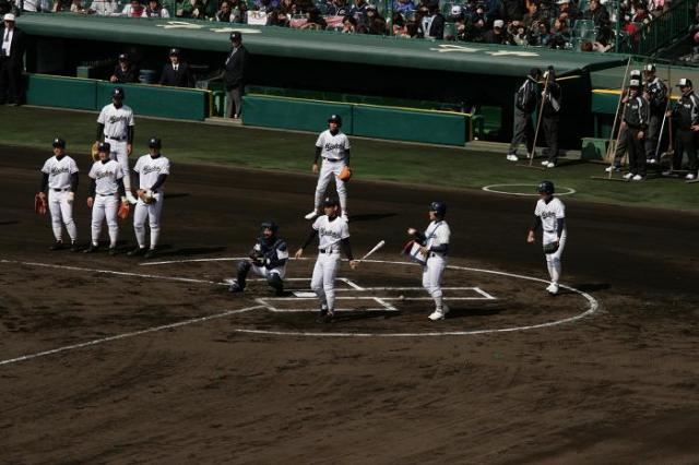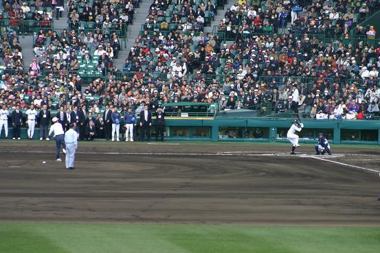 開会式が1時間ほどで終わると、三重高校の選手がグラウンドにグローブやバットを持って姿を見せ、ノックが始まりました。その後の始球式ではキャッチャーの小林くんが平野文部科学大臣の球を受けました。いよいよ開幕試合です。