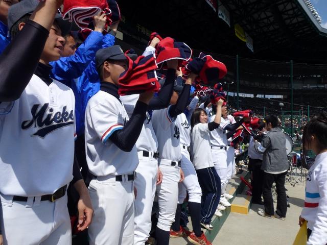 1回の裏には石崎くんの左中間を抜く3塁打と岡本くんのセンターへの犠打で先制し、三重高ペースで試合を進められるかと思ったものの、3回表には2点を取られ逆転を許しました。その回の裏にはまたも岡本くんのタイムリー内野安打で同点に追いつきました。その後5回裏にも加点し、勝ち越しましたが、7回表には、またしても同点に追いつかれ3対3に、追いつ抜かれつの展開のまま試合は終盤を迎えました。「試合は僅差で進み、終盤で決まるだろう」との戦前の予想が頭に浮かび、期待と不安を抱えながら8回を迎えました。8回表の守備を無難にこなし、迎えた8回裏、安打を重ねて3点を取った時点で、アルプス席応援席では「よしっ、勝てるぞ」「9回を抑えよう」の声が聞こえました。しかし、甲子園は甘くありませんでした。9回に2点を取られ、なおランナー2人を背負い、一打同点、長打で逆転の場面を迎えました。しかし、ピッチャーの三浦くんが踏ん張りました。最速147kmの速球に切れ味のいいスライダーを織り交ぜ、バッターと真っ向勝負。三振を奪って勝利を勝ち取りました。