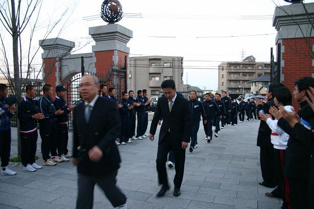 生徒・職員・保護者・ファンが正門から玄関までの通路の両側を囲む中、中田部長を先頭に、沖田監督と選手が帰校し、報告会がありました。