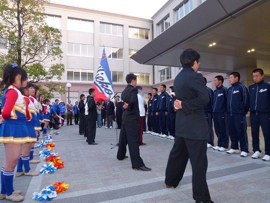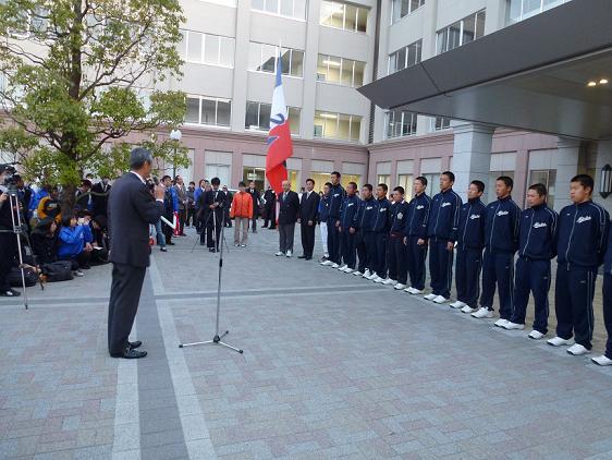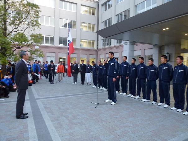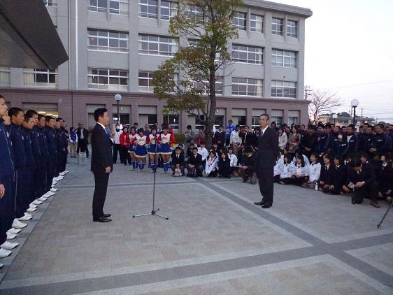 沖田監督から帰校報告があり、その中で「深夜、また早朝より応援に駆けつけていただきありがとうございました。人文字の応援も励みになりました。皆さんには心よりお礼申し上げます。今日は残念な結果になりました。一球の怖さと難しさを実感しました。チームを鍛えなおして、夏にもう一度あの舞台に立ちます」との言葉がありました。また、退任する小森副部長にも感謝の言葉が述べられました。