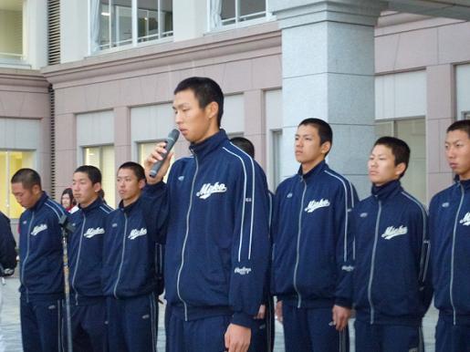 岡本主将からは「初めての甲子園でしたが、皆さんの人文字や声援が力となって、おじけづかずに普段通りのプレーができました。選手一同感謝しています。夏に向けてこれから練習する上で、いい経験になりました。ありがとうございました」とお礼の挨拶がありました。