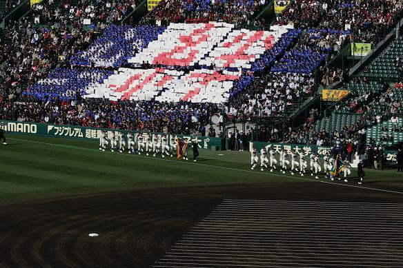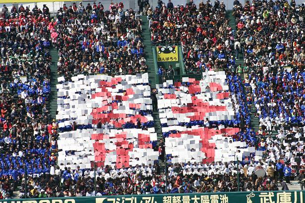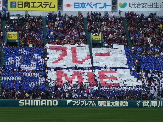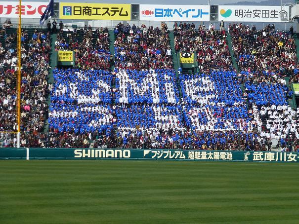 甲子園球場で行われていた選抜高校野球で、三重高校の応援に対して応援団優秀賞が贈られました。三重中学・三重高校の全校生徒に加え、保護者や卒業生など2000人を超える大観衆が球場に駆けつけました。選手と応援席が一緒になって、若々しく爽やかな応援を繰り広げました。本年は創立50周年の記念の年であることから、三重高校伝統の応援に加えて、青地に白で「心一つMie50」、被災地に向けて白地に赤で「絆」などの人文字を作りました。