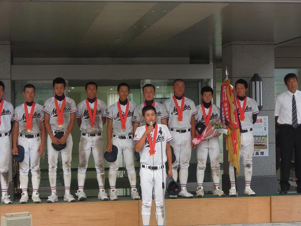 7月30日(火)、18:30より第95回全国高校野球選手権大会三重県大会で優勝した選手の到着を待って、報告会が行われました。生徒、教員、保護者、そして地域の方に大勢集まっていただきました。松阪市の小牧副市長からもお祝いと激励の言葉をいただき、選手紹介などのあと、山岡主将からお礼と甲子園に向けての力強い決意の言葉がありあました。