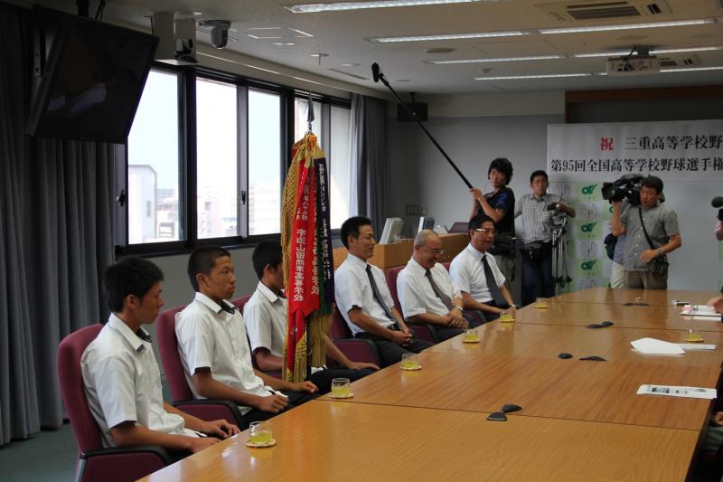 8月1日に第95回全国高等学校野球選手権大会出場の報告のために三重県知事を表敬訪問し、意気込みを語りました。鈴木英敬知事からは「激戦を勝ち抜いてきた分、全国大会ではさらなる活躍を期待している。一勝でも多く勝ってほしい」との言葉をいただきました。沖田展男監督は「一戦一戦、着実に成長してくれた。高校生の無限の可能性を感じた」と振り返り、「開幕までしっかり準備し、4年ぶりの夏の勝利を県民に届けたい」と抱負を語りました。本校野球部は4日に甲子園に向けて出発し、5日に甲子園練習にのぞみます。