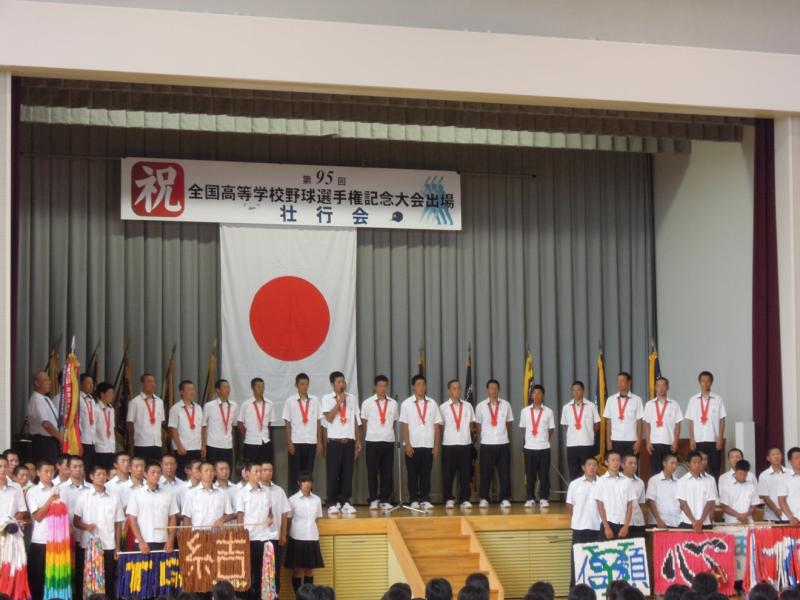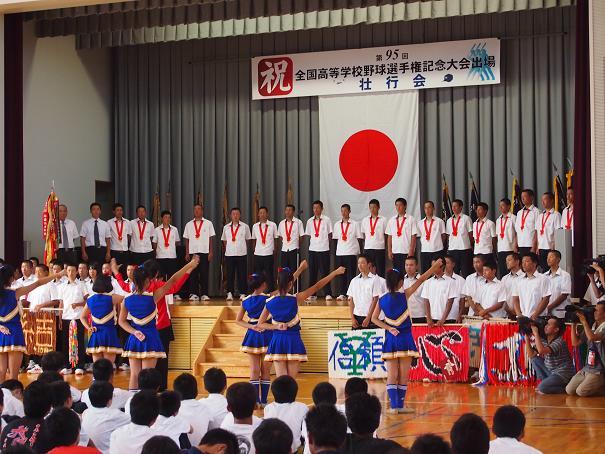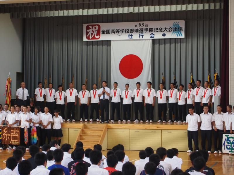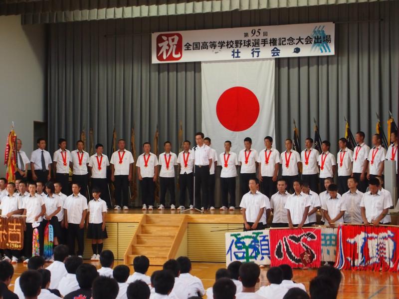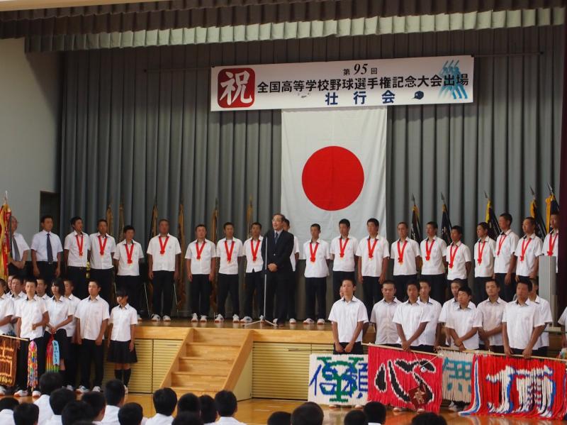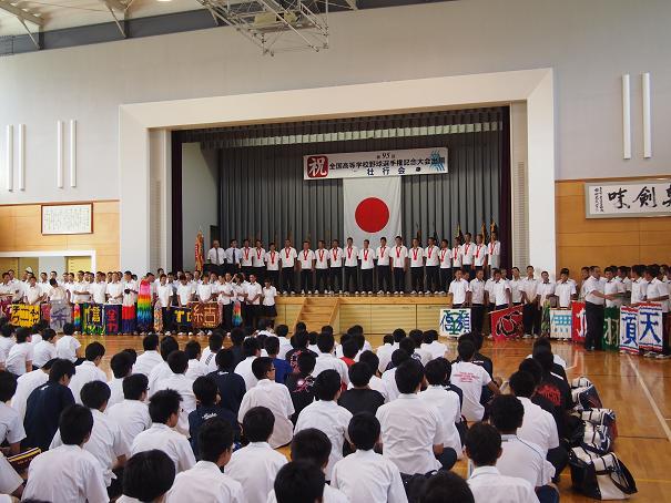 会場に集まった生徒や保護者のみなさんによる割れんばかりの拍手のなか、野球部の選手たちが入場し、式典が始まりました。今年は自校の千羽鶴に加えて県大会で敗れた他の61校から託された千羽鶴を携えての式典となりました。沖田展男監督による挨拶と選手紹介に始まり、学園代表者、来賓の方々、生徒会長から祝辞や激励のことばがあり、それをうけて山岡祐貴主将から甲子園での活躍を誓う力強いことばが聞かれました。会場の心が一つになったところで、応援部や吹奏楽部によるエールがおくられて式典は最高潮に。最後に中田和男部長から甲子園での勝利をめざす意気込みが語られました。大きな拍手がわきおこり、拍手から生み出される激励と期待のしぶきを全身に浴びながら選手たちが退場して式典は終了しました。