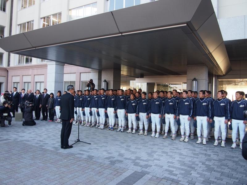 数多くの激励を受け、沖田展男監督、長野勇斗主将、中田和男部長から力強く甲子園での活躍を誓いました。
