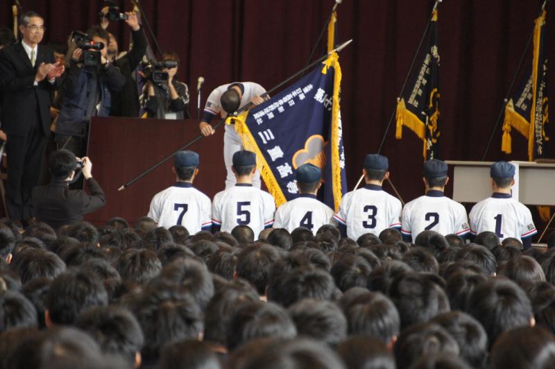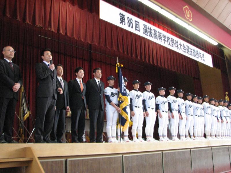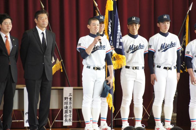 選手入場のあと、選抜旗が毎日新聞社中部代表 渡会文化様より垂髪隆一校長へ、さらに長野勇斗主将へと手渡され、会場は拍手の嵐に。来賓によるお祝いと激励のあいさつを受け、垂髪隆一校長からの謝辞がありました。続いて沖田展男 硬式野球部監督からのあいさつの後、選手一人一人が自己紹介をして甲子園での活躍を誓い、しめくくりとして選手代表の長野勇斗主将が決意のことばを述べました。最後に全員で校歌を斉唱し、会場が一つになって甲子園で三重高校の名をとどろかせる決意を新たにしました。