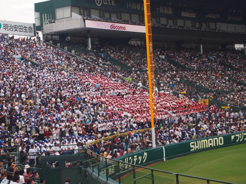 球場に入場すると、試合直前には小雨が降り、天気は不安定でした。試合はそれに対してキリッと引き締まった展開になりました。広島県代表の広陵高校は野球の名門らしく、はつらつとしたプレーと、息が合って秩序だった応援はさすがで、1塁側アルプスを埋め尽くすこちらの大応援団も負けないように声援を送りました。