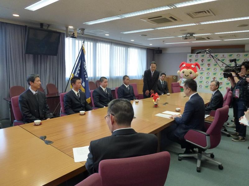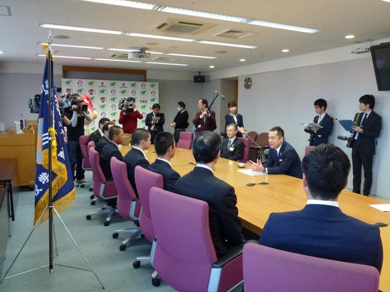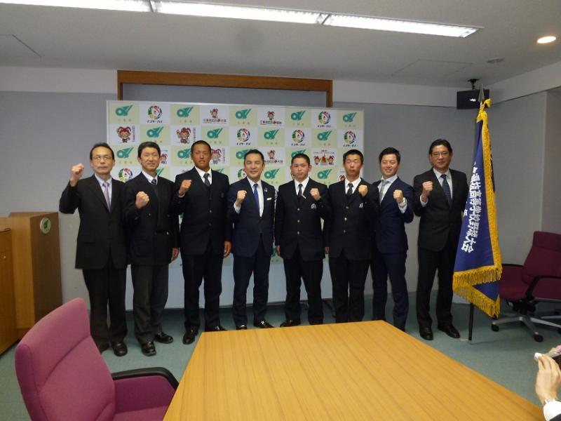 3月12日(月)、定本主将、東選手、曲選手、梅村学監、中谷校長、松井部長、小島監督が三重県庁を訪問し、3月23日(金)に開幕を迎える第90回記念選抜高等学校野球大会出場の報告をしました。