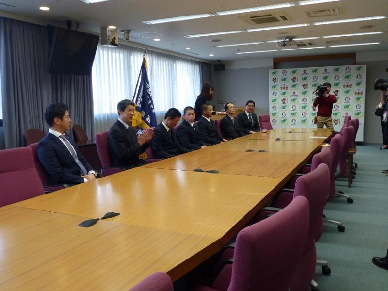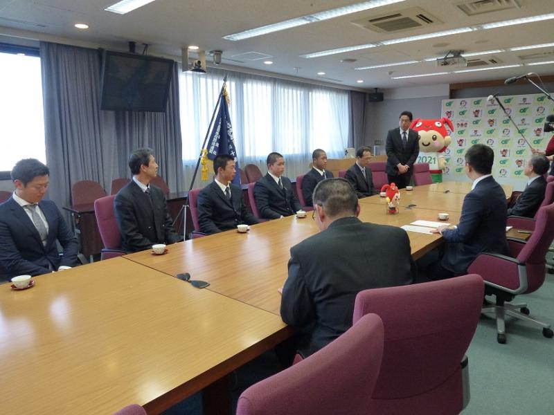 三重県庁では、鈴木英敬知事様に温かく迎えていただき、激励のお言葉をいただきました。鈴木知事様からは、「これまで支えて頂いている多くの皆さんに感謝の気持ちを忘れず、三重県が元気になるようなプレーを期待しています」などとのお言葉を頂きました。