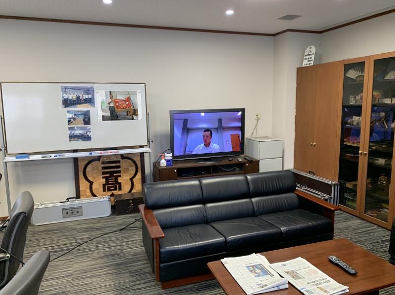 本校では、オンライン抽選会に合わせ、校長室でコンピュータのカメラに向かって池田キャプテンがくじを引きました。