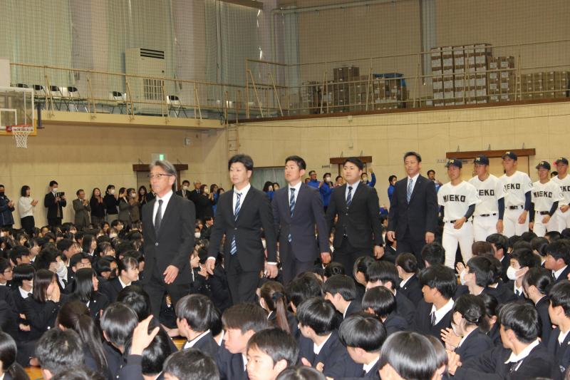 式には全校生徒と教職員が参加し、8年ぶり14回目となるセンバツ出場を決めた野球部を学校全体で祝福しました。