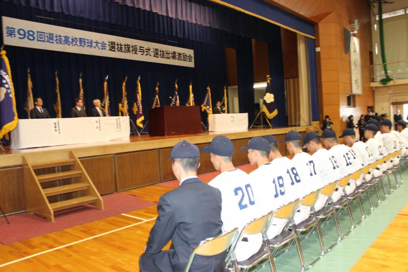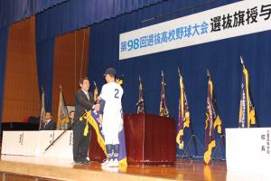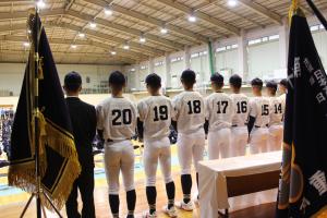 3月9日(月)、本校第1体育館において、第98回選抜高等学校野球大会(春のセンバツ)に出場する本校硬式野球部への選抜旗授与式を挙行しました。