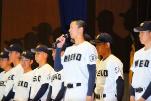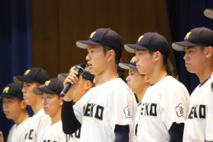 選手たちからは、自分のプレーでのアピールポイントが一言一言述べられました。各選手からは、甲子園の舞台で全力を尽くそうとする強い決意が感じられ、体育館に集まった生徒たちから温かい拍手が送られました。