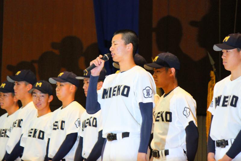 三重県高等学校野球連盟会長 水谷 様より、本校硬式野球部へ選抜旗が授与されると、会場からは大きな拍手が送られました。水谷会長からは「三重県代表としての誇りを胸に、堂々としたプレーを期待しています」と激励のお言葉をいただきました。